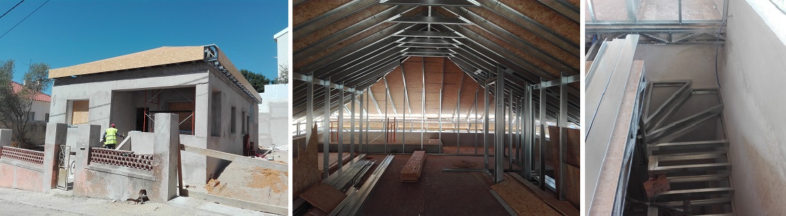 Está concluída a estrutura em aço galvanizado leve + OSB da cobertura de quatro águas desta moradia no Cacém.